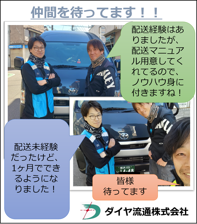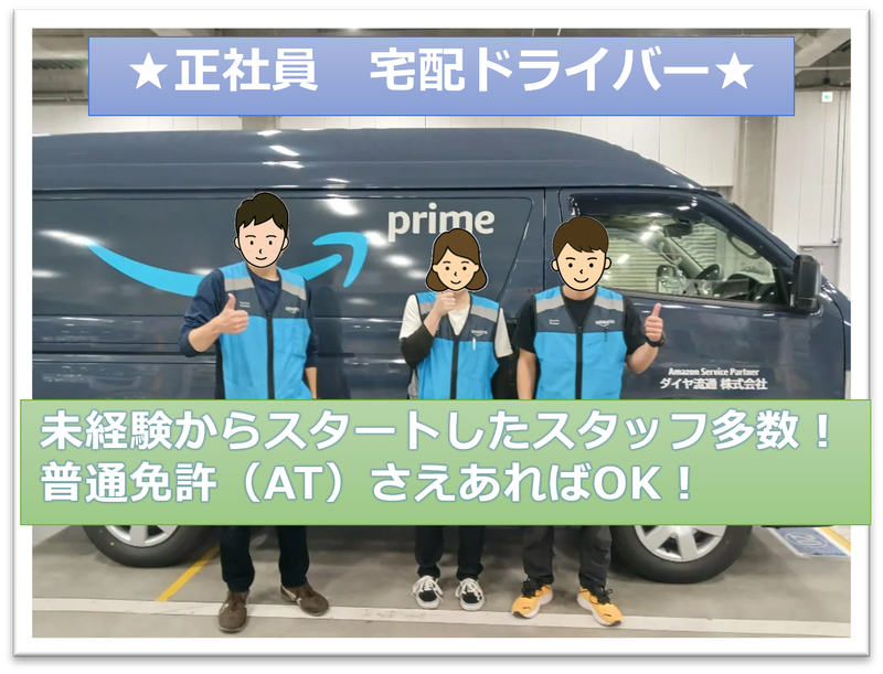 仕事内容 宅配ドライバー 正社員募集! ★ 月給32〜40万円!高収入 ★ **普通免許があればOK!**未経験でも安心の研修制度あり! ★ 1tバン車での宅配業務(EC大手企業の配達) ★Amazonオフィシャル配送サービスパートナー(DSP)ですので、お仕事安定しています! 【☆一日の流れ☆】 7:00 出勤&点呼 7:30 配送スタート! 12:00 休憩1時間 16:00 午後の配送 18時くらいには 帰庫&業務終了 ☆彡仕事はアプリの指示に従って、配送をしていきます!スマホも会社からもちろん貸与です! 1日おおよそ200個~近く配達しますが、皆さん慣れれば問題なく配達できます! 配達が遅れることがあれば、社員間で応援に入りますので、チームワークで経験を積んでいってください! ・基本は置配がメインです!(全体の90%程度) ・車は1tバン車両に載って配送します!普通免許(AT)があれば問題ございません! ◎ こんな方にオススメ! ・ 車の運転が好きな方 ・ しっかり稼ぎたい方 ・ 安定した正社員で働きたい方