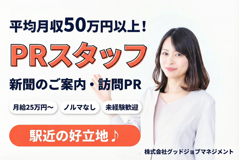 仕事内容 【この求人のポイント】 ✅ 未経験スタート多数/研修・サポート充実 ✅ 月給25万円+インセンティブでしっかり稼げる ✅ 平均月収50万円以上/安定収入も実現可能 ✅ ノルマなし&無理な営業なしで安心 ✅ 駅近の好立地! 【仕事内容】 新聞の魅力をお客様へご案内するPR・営業のお仕事です。 販売店から提供されるリストをもとに、 お客様宅へ訪問し、 お試し購読や定期購読のご案内を行います。 ■具体的には ・担当エリアのお客様へ訪問 ・新聞の魅力やサービスのご説明 ・お試し購読のご案内 ・スマホで簡単な報告入力 無理な営業や押し売りは一切なく、 お客様との会話を大切にするスタイルです。 【1日の流れ(例)】 10:00 出社・朝礼 11:00 訪問スタート 17:00 休憩・移動 19:00 帰社・報告 20:00 退勤 【研修・サポート体制】 ・入社後1週間の基礎研修 ・先輩との同行スタート ・マンツーマンでのフォロー体制 未経験からでも安心してスタートできます!