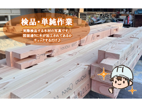 お仕事内容 <積極採用中> ◆木材の検品・フォークリフト作業を行っていただきます。 ①木材の検品 加工された木が機械で流れてくるので、図面通りに加工が行われているか目視と触って検品していただきます。 ②フォークリフト作業 加工された木のまとまりをカウンターフォークリフトを運転して移動させていただきます。 一部木を持って移動することがありますが、1人で持つことは基本的に無いのでご安心ください。 *休憩室、ロッカー、冷蔵庫など完備しております♪ *フォークリフトの資格を取りながら勤務OK、フォークリフトの資格を取ってから勤務でもOKご希望にお合わせします。