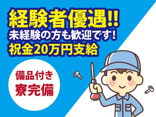 仕事内容 入社祝金20万円支! ※はじめて入社の方が対象!規定あり。 「オススメポイント!」 ・入社日から有給休暇あり! ・備品付き寮完備!(冷蔵庫・洗濯機・レンジ) ・稼働分の前払い制度あり! ・頑張りによって昇給あり! ・無期雇用への切り替え可能! 「主なお仕事内容」 ドライバーやレンチを使用しての 組立や装置の検査、出荷準備など。 各種工程で様々な作業があります。 「このような方へオススメです!」 〇安定した仕事をお探しの方! 〇知識・技術を身につけたい方! 〇未経験でも新しくチャレンジしたい方! 経験者の方積極採用! 経験者の方は即戦力として活躍していただきます! 冷暖房完備のため快適空間!とても綺麗な職場です。 幅広い年齢層の男女共に多数活躍中! 「プロワーカー」であなたにピッタリのお仕事がきっと見つかる! 派遣が初めての方も担当スタッフがしっかりサポートします! 就業前の不安や疑問など安心してご相談いただけます! まずはお気軽にお問い合わせください。