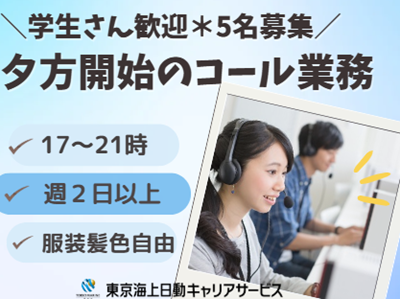 ~学生歓迎!夕方×週末のコール業務~ ◆17時~21時×金土日いずれか含む週2日以上 ◆服装&ヘアカラー自由 ◆就活にも役立つ!<電話スキル><敬語><ビジネスマナー>身に付きます