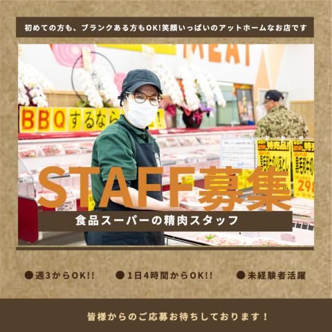 募集要項 職種 食品スーパーの精肉(品出し)スタッフ 雇用形態 パート 仕事内容 肉の加工・調理、パック詰め、値付け、品出し、接客など 【具体的には】 その日の売れ行きに合わせてお肉のスライスやパック詰め、 その他品出しや接客を行なっていただきます。 <超厚切り?変わり種?商品も> 「日本一楽しいスーパー」を目指す当社では 牛肉、豚肉、鶏肉を中心に超厚切りに切ってみたり、変わった食材をスライスしてみたり 毎日新鮮な気持ちで働いていただけます。 今いるスタッフも初めは短期や単発でのアルバイトを探していたけど、 長期的に働いてくれているほど毎日新鮮な気持ちで働ける環境です。 未経験から始めた先輩がたくさんいて一緒にサポートしますので未経験の方も ご安心ください。