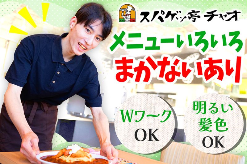 【仕事内容】 三河で50年近い歴史があるあんかけスパゲッティのお店「スパゲッ亭チャオ」でホールスタッフ大募集! ・学生の方 ・バイトデビューの方 ・人気のあんかけスパ店で楽しく働きたい方 ・人と接するお仕事が好きな方 ・未経験OKのバイトを探している方 などにぴったりのお仕事です。 ✅お仕事内容 はじめは「お客様をお席へご案内」など、笑顔での対応からスタート!慣れてきたら少しずつレジや盛り付けもお任せします。 難しい作業は一切なし!2〜3回の勤務で自然に覚えられますよ⭐ 教育体制もバッチリ!20代女性社員が丁寧にサポートします! 学生さんを中心に活躍中の職場です。 年が近いので、和気あいあいとした雰囲気で働いています✨ ===================== ムリなくお小遣い稼ぎができます! ===================== シフトの相談もでき、学業やプライベートと両立しながら楽しく働けます! ・週3回からの勤務でOK ・16時~21時の勤務でOK ・シフトの相談可/WワークOK ・美味しいまかないつき ✨オシャレをしながら働けます✨ 髪色は茶色~ペールイエローまで、レベルはJHCAレベルスケール15までOK。かなり明るい髪色でも勤務できますよ! カラコンも黒・茶系ならOKです。 少しでもご興味を持っていただけた方、 ぜひお気軽にご応募くださいね! 【求人ID-MUK】