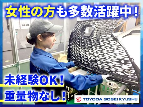 仕事内容 【お仕事内容】 <豊田合成九州(株)本社工場でのお仕事です!> 自動車部品に使用される合成樹脂製品の製造を行っている企業! 手のひらサイズの樹脂製品に部品を取り付けたり、検査を行っていただきます。 ★どれも簡単作業なので未経験でも安心◎ <作業内容の詳細は…> ■検査(1人作業) 機械が合成樹脂を成型するので、品質チェック。 外観の傷・汚れ・ムラがないかの確認や 異常が無いかを目視でチェックし、 問題がなければ箱に置き、運搬工程の担当者に渡します。 ■機械塗装オペレーター・検査(1人作業) 運搬担当者が運んできた製品の塗装及び検査 機械が塗装をするので、機械のオペレーター業務。 塗装後は、真っ暗な個室の部屋で白いライトを当てて 外観の傷・汚れ・色・光沢・ムラがないかを目視検査。 ■組立(2人作業) 1人が準備作業、1人が組立作業を行います。 ・準備(ピッキング作業) 各部品を取りに行き、準備します。 ・組立 準備された部品を指示書の通りに手作業で取り付け。 ドライバーを使用することもあります。 ■運搬(1人作業) 車輪がついている大きいラックを使用して、 工程から工程に部品や完成品を運ぶ作業。 1日1万歩程度歩きます。 <工程の流れ> 製造工程は検査→塗装→組立。 各工程の合間に運搬作業があります。 ★サイズは1m程度で、重さは400~800gと軽量 ★作業は約2週間で覚えることができ、焦らずじっくり習得できます! \製造未経験の方も大歓迎です!/ ★経験・職歴は一切不問です!工場未経験OK♪ ★20代~30代後半の男女活躍中! ★今回募集中の工程では女性スタッフさんも多数在籍◎ 【ここがポイント!】 ●髪型・髪色自由、ピアスOK!ネイルのご相談もOK♪(規定有) ●私服での勤務 ●マイカー通勤OKです♪工場には無料駐車場が完備◎ ●重量物の取り扱いがなく、お体への負担が少ない◎ ●男女活躍中◎ ●土日休み+年末年始・GW・夏季休暇などの長期休暇もございます! →プライベート時間も大切にできます◎ ●友達同士の応募もOK! ●スグに働きたい方も歓迎! 【完全個室の寮完備!】 遠方からのご応募も大歓迎! 快適な寮をご用意しております◎ ▼寮の一例 ・間取り:1K ※物件により異なります ・家賃:月々50,000円~60,000円 ・光熱費:自己負担(給与控除) ・駐車場完備:月額6,000円 ・備品:リース可 ▼リース可能な備品について テレビ、洗濯機、冷蔵庫、ガスコンロ、布団 ⇒全てレンタルで、月額9,000円でご利用いただけます! ☆寮~工場まで 車、バイク、自転車でご通勤いただけます! 所要時間は車で15分程度です◎ これからひとり暮らしを始めたい方や、 住み込みでお仕事されたい方も大歓迎です! まずはお気軽にお問い合わせください◎ ≪前払い制度使えます≫ ご入社後の稼働分で前払い可能です!(規定有) しかも、アプリでカンタンに申請できちゃう! 《紹介キャンペーン増額中!》 今なら、紹介してくれた方に10万円、 紹介で入社してくださった方にも5万円をプレゼントいたします! ※規定有
