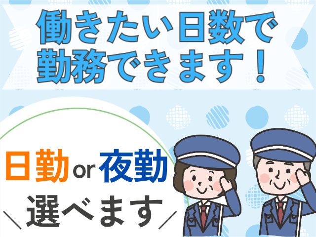 仕事内容 <日勤・夜勤選べます!> 勤務日数の相談・WワークOK! ライフスタイルに合わせて働けます! 専門学生・大学生もOK! 短時間勤務希望の方もご相談ください! \警備スタッフ(アルバイト・パート)募集!/ 工事現場などでの交通誘導やイベント警備、雑踏、駐車場警備など様々な警備業務があります。 車両や歩行者の安全を守るやりがいあるお仕事です! 50代からのミドル・中高年・シニア世代の男女警備スタッフが活躍しています。 <日勤または夜勤どちらか固定勤務OK!> ・生活リズムを安定させたい→日勤 ・収入を増やしたい→夜勤 あなたの希望に合わせて働くことができます。 勤務日数相談OKなのでWワークも可能! 短時間勤務/土日のみ/平日のみ、といった働き方もOK! 勤務日数を自分で決められるので、体への負担も少なく、長く続けられます! <研修あり!警備員経験がない方もOK> 採用後に最低4日間の研修があるので警備未経験でも安心して働けます。 初めての現場デビューの際は、先輩警備員や指導者と共に業務にあたります。 警備員経験がある方、有資格者の方は即戦力として活躍いただけます! <長期安定して働けます> 大手企業様からの依頼が多いので警備のお仕事は景気に左右されず、安定して働けるのもポイントです。 <警備員:おすすめポイント> ・勤務日数相談OK ・短時間勤務OK(午前のみ、深夜、夜間など) ・土日のみ、平日のみの勤務OK ・扶養内勤務OK ・WワークOK ・制服貸与 ・研修制度あり ・50代・60代の中高年・シニア世代も活躍中 ・正社員登用制度あり ・日勤専属、夜勤専属相談可 警備経験は問いませんので、無理せず働きたい方も、正社員を目指して頑張りたい方も警備に興味がある方はぜひご応募ください!