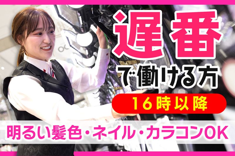 【アピールポイント】 ⭐️遅番勤務スタッフ募集⭐️ パチンコ・スロット店のホールスタッフを募集! ✅16時以降で学校終わりに働きやすい ✅土日祝は時給アップ! ✅未経験OK ✅週3日~OK ✅社員登用あり お気軽にご応募ください!✨
