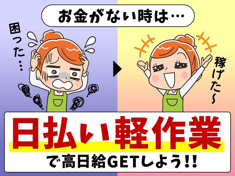 求めている人材 <歓迎条件> ・軽作業など未経験歓迎 ・ブランク歓迎 ・Wワーク、副業歓迎 ・空き時間にサクッと働きたい方 ・長期休暇のタイミングだけ働きたい方 ―――こんな方が登録&活躍中――― ◎のびのび働きたいフリーター ◎軽作業がはじめての方 ◎時間に制限のある ◎大学生・専門学校生・短大生 ◎主婦主夫・既婚者の方 ◎旅行代を稼ぎたい方 ◎扶養内・スキマ時間で働いている方 ―――――――――――――――――― 雇用契約が30日以内の派遣は下記の方が対象 ◆60歳以上の方 ◆雇用保険の適用を受けない学生の方 ◆年収500万円以上の方(副業として働く方) ◆ご自身が世帯の生計者でなく、 世帯収入が500万円以上の方
