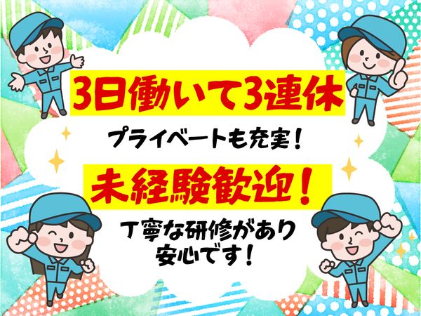 仕事内容 ✧✧ お仕事内容 ✧✧ リチウム電池(ガスメーター、警報器、医療機器、カードなどに使用)の製造 主に設備への材料投入、製品取り出し、エラー対応、製品運搬などをお願いします。 ◆・*・◆~~◆・*・◆~~◆・*・◆~~ ✧✧ 未経験歓迎 ✧✧ 研修が充実していますので、未経験からでもスタートできます!研修終了後も先輩スタッフが教えてくれますので、わからないことがあれば放置せず遠慮なく聞いてください! ◆・*・◆~~◆・*・◆~~◆・*・◆~~ ✧✧ 必ず3連休♪ ✧✧ 3連勤の後は必ず3連休!週2日休みに比べて1日多いので、余裕をもってスケジュールを立てられます。週2休みだけでは物足りない!プライベートを重視したい!というあなたにぜひ! ◆・*・◆~~◆・*・◆~~◆・*・◆~~ ✧✧ 待遇・制度が充実 ✧✧ 社会保険の完備はもちろん、賞与年2回、交通費支給、各種手当、資格取得促進支援制度、正社員登用制度など制度が整っています。長く安定して勤務したい方はぜひ! ■*:;:*■*:;:*■*:;:*■*:;:* ✧✧ おすすめPOINT ✧✧ ★高時給1300円! しっかり稼いで安定収入! ★未経験歓迎! 充実した研修制度! ★正社員登用制度あり! キャリアアップを目指して成長できる! ★資格取得促進支援制度あり! スキルアップのチャンス