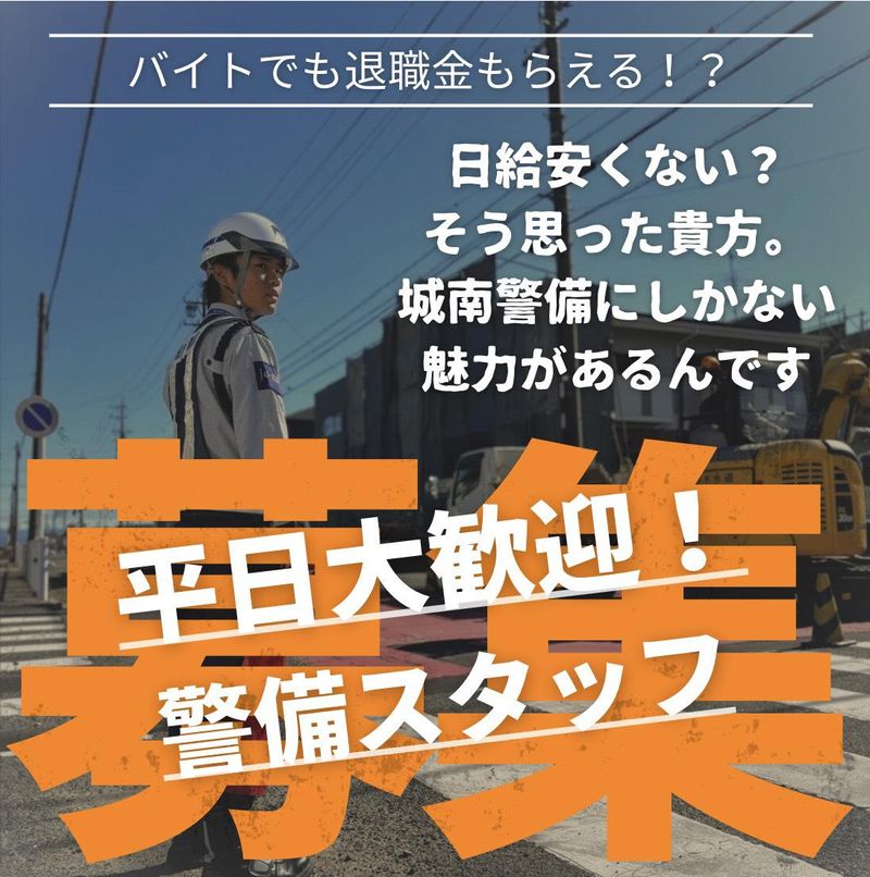 仕事内容 【4月限定・特別募集】警備スタッフ★ \秋の国際大会に向けて今からスタート!/ この秋に開催される「国際大会」に向けた警備体制強化のため、4月限定の特別採用を実施します! ■この募集の目玉!国際大会での特別待遇  ̄ ̄ ̄ ̄ ̄ ̄ ̄ ̄ ̄ ̄ ̄ ̄ ̄ ̄ ̄ ̄ ̄ ̄ ̄ ̄ 秋に予定されている国際大会の現場では、時給2,000円の特別単価を支給します! 短期間でしっかり稼ぎたい方に最適です。 大会当日にスムーズに動けるよう、まずは4月から通常の現場で実践を積み、自信を持って本番を迎えていただきます。 ■未経験◎自分のペースで働ける誘導・案内  ̄ ̄ ̄ ̄ ̄ ̄ ̄ ̄ ̄ ̄ ̄ ̄ ̄ ̄ ̄ ̄ ̄ ̄ ̄ ̄ 豊田市周辺を中心に、毎日豊富な案件があります。 希望に合わせてお仕事を選べます! ・水道工事現場での工事車両や一般の方(歩行者)への誘導 ・サッカーやバスケットボールの試合会場での観客・車両誘導 ・建築中の敷地内での関係者の出入り管理や巡回警備 ・車両管理をしている敷地での巡回警備 ・イベント警備 ・某ホームセンターでの駐車場警備 →様々なお仕事があります! 【通勤スタイルも柔軟に選べます】 ◎直行直帰OK:ご自宅から現場へ直接向かい、終了後はそのまま帰宅可能です。 ◎会社集合もOK:一度会社に集まってから、社用車で現場へ向かうこともできます。 ※交通費は公共交通機関の場合全額支給、車・バイクの場合はガソリン代規定支給でしっかりサポートします。 ■特大特典延期決定!(5月までに入社した方限定)  ̄ ̄ ̄ ̄ ̄ ̄ ̄ ̄ ̄ ̄ ̄ ̄ ̄ ̄ ̄ ̄ ̄ 「週4日以上」勤務できる方を探しています! そのため、今回は破格の待遇をご用意しました!! ⭐半年間は毎日お給料UP! 平日なら+1,200円、土日なら+1,750円を毎日上乗せ。 半年間(平日月20日勤務想定)で、約14万4000円も収入が変わります! ⭐1年頑張れば「10万円」支給! 6ヶ月経過後はいったん通常日給に戻りますが、そのまま1年継続(週4日以上勤務)していただくと、入社祝い金として【10万円】を一括支給! 長く安定して働きたい方には、またとないチャンスです! 【期間限定募集!】 面接~採用まで1週間ほどかかる場合があるため、お早めのご応募をお願いします! ■働きやすさへの取り組み  ̄ ̄ ̄ ̄ ̄ ̄ ̄ ̄ ̄ ̄ ̄ ̄ ̄ ✅快適に働ける充実の装備 制服や装備品はすべて会社が無料貸与! 特に暑い時期には「空調服」とそのバッテリーを2個支給したり、現場に冷暖房完備の休憩車両やパラソルを設置したりと、身体への負担を減らす工夫を徹底しています! ✅柔軟なシフト対応 「週1日だけ」「土日のみ」など、希望に合わせて働き方を変えるのももちろん大歓迎! シフト変更も前日の朝まで相談可能なので、プライベートの予定も立てやすい環境です。 ✅子育て・家庭との両立を応援 お子様の急な体調不良によるお休みや、学校行事なども考慮します。 面接時にお子様連れで来社いただいたり、状況に応じて送迎のサポートを行ったりと、家庭を持つスタッフが長く働ける環境作りに力を入れています。
