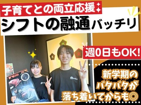 勤務時間 ・勤務曜日:月・火・水・木・金・土・日・祝 ・勤務時間: [1] 12:00~21:00 ・最低勤務日数(週):1日 シフトサイクル:2週間 12:00~21:00 その他、 12:00~16:00 15:00~19:00 18:00~21:00 19:00~23:30 など その他の時間帯もご希望があれば相談OK! ★週1日・1日3時間~OK ★シフトは2週間毎の自己申告制 ★「週末のみ」もOK ★「家庭の事情」や「テスト期間」で週0などシフトの融通利きます! ★扶養内OK <こんな経験も活かせます◎> 喫茶店、カフェ、居酒屋、レストラン、ホテル、焼肉店、ラーメン店、パン屋 和食、寿司、イタリアン、中華、洋食、フレンチ等などの飲食店で ホールスタッフや調理補助、調理スタッフ、キッチンスタッフなどの経験がある方や コンビニ、アパレル販売、ドラッグストア、百貨店、スーパー等で接客経験ある方も大歓迎!