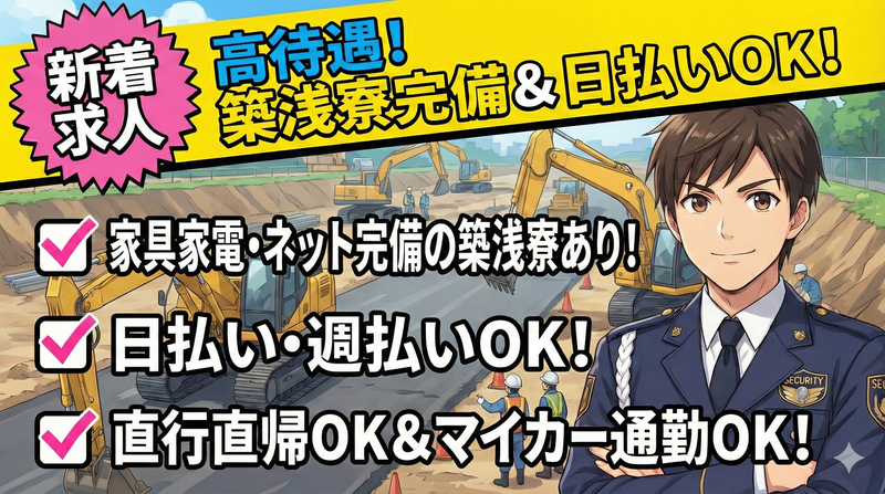 仕事内容: ┏━┓┏━┓┏━┓┏━┓ ┃新┃┃着┃┃求┃┃人┃ ┗━┛┗━┛┗━┛┗━┛ ━━━━━━━━━━━━━━━━━━━ 入社祝金10万円&家具家電付きの寮完備! 早上がりでも”日給全額保証”安定して働ける人気アルバイト━━━━━━━━━━━━━━━━━━━ 幅広い世代が自分らしく活躍中。 充実の手当&サポート体制&自社寮完備♪ ■□■──────────■□■ この求人の魅力ポイント ■□■──────────■□■ ✅電話面談、電話面接、Web面接OK! ✅入社祝金10万円支給(規定あり)でホクホク! ✅家具家電・ネット完備の築浅寮あり!借り上げ社宅あり! ✅日払い・週払いOK(規定)で急な出費も安心! ✅早上がりでも「日給全額保証」で損なし! ✅週1日〜OK!ライフスタイルに合わせて働ける! ✅3日間の丁寧な法定研修あり(研修中も日給保証)! ✅運転手当・資格手当・精勤手当など加算が豊富! ✅髪型・髪色・ネイル自由!オシャレも諦めない! ✅直行直帰OK&マイカー通勤OKで通勤ストレスゼロ! ✅空調服、熱中症対策(ドリンク支給)あり! ✅20代〜70代まで、穏やかな仲間が多数活躍中! ✼ ┈┈┈┈┈┈┈┈┈┈┈┈┈✼ 【仕事内容】 あま市・名古屋市エリアを中心に、 道路工事や建築現場での「交通誘導警備」を メインにお任せします。 地域の人々の安全を守る、やりがいのあるお仕事です。 <具体的な仕事内容> ■□ 交通誘導警備(メイン業務) ・ 道路工事現場での誘導 ・ 建築現場における工事車両の搬入・搬出誘導 ・ 片側交互通行や通行止め時の迂回案内 ・ 歩行者や自転車の安全確保・お声がけ ※時期により、商業施設などでの駐車案内・歩行者誘導や 雑踏警備・ イベント警備の現場もございます。 ✼ ┈┈┈┈┈┈┈┈┈┈┈┈┈✼ 【勤務時間】 08:00~17:00(実働8時間・休憩60分) 08:30~17:30(実働8時間・休憩60分) ✅週1日〜勤務OK! ✅フルタイム(週5日)大歓迎! ✅ 現場により早上がりあり(最短2時間の実績あり) ✼ ┈┈┈┈┈┈┈┈┈┈┈┈┈✼ 【給与】 日給 9,500円〜12,000円 ✅入社祝金10万円支給(規定あり) ✅ 日払い・週払いOK(規定あり) 【各種手当】 ・交通費支給(規定/車の場合はガソリン代支給) ・運転手当(自家用車:1人につき300円/社用車:1人につき200円) ・資格手当(警備業務検定2級保持者) ・精勤手当 ・運転手当(自家用車持込みの場合) ✼ ┈┈┈┈┈┈┈┈┈┈┈┈┈✼ 【休日・休暇】 ✅シフト制 ✅週1日からの自由なシフト設計が可能 ✅平日のみ・土日祝のみも相談OK ✅扶養内勤務やWワークも歓迎" ■□■─────────────■□■ 【寮について】 カバン一つで即入居OK! 快適な新生活を応援する「自社寮」完備 ■□■─────────────■□■ 「働きたいけど住む場所が…」 「初期費用を抑えたい」 そんな方もご安心ください! 当社では、健康面と快適な暮らしに配慮した 自社運営の寮をご用意しています。 面倒な手続きなく、すぐに新生活をスタートできます。 ✅ 家具・家電付きで余計な出費なし! 生活に必要なものは全て揃っています。引越し費用も最小限でOK♪ ・エアコン・ベッド完備(夏も冬も快適!) ・洗濯機・冷蔵庫あり(買い揃える必要なし!) ・キッチン(IHコンロ)完備(自炊派も安心♪) ・ユニットバス(プライベートも確保!) ・駐車場完備(マイカーの持ち込みもOK!) 【入寮条件は月16日以上勤務できる方 】 「ガッツリ稼いで、家賃も節約したい」という方に ピッタリの環境です! ✼ ┈┈┈┈┈┈┈┈┈┈┈┈┈✼ 【待遇】 ・社会保険完備(法令による) ・試用・研修期間3日間(条件変動なし) ・ 昇給あり ・入社祝金10万円支給(規定) ・独身寮完備(築3年) ・家具家電ネット完備 ・借り上げ社宅あり(会社負担あり、築浅物件あり) ・空調服あり ・熱中症対策(OS1、お茶、水、アメ等支給) ※週4日以上勤務の方/規定 ・日払い ・週払いOK(規定) ・車通勤OK ・バイク通勤OK ・直行直帰OK ・髪型・髪色自由 ・ネイルOK ・資格取得支援制度あり ✼ ┈┈┈┈┈┈┈┈┈┈┈┈┈✼" ❖「心にゆとりを持って働ける場所」❖ ❖それがアーバンガードです❖ 私たちの仕事は、 地域の安全を支えること。 そのためには、 働くスタッフが安心して生活できることが 第一だと考えています。 ✅住まいを探しているなら、キレイな寮を用意します ✅すぐにお金が必要なら、日払いで対応します ✅体力に自信がないなら、無理のないシフトを組みます 「もう一度働きたい」 「長く安定して続けたい」 そんな想いを全力でサポートします。 年齢を問わず、全員が主役となって声を掛け合いながら働ける職場です。 ✼ ┈┈┈┈┈┈┈┈┈┈┈┈┈✼ 【選考について】 面接1回(即決・即入社も相談可) <入社までの流れ> 1.応募(フォームまたはお電話) 2.書類選考 3.面接(履歴書持参/1回) 4.内定 ・面接日・入社日はお気軽にご相談ください。 ・電話面談、電話面接、Web面接OK ! ご都合に合わせられます! ✼ ┈┈┈┈┈┈┈┈┈┈┈┈┈✼" ◎一つでも当てはまったら是非ご応募ください◎ ・学歴