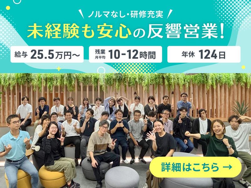 求めている人材 ◆20代・営業未経験者活躍中! ☆このような方、大歓迎☆ ●成長を実感したい方 ●チームの知識やノウハウを結集して課題解決に当たりたい方 ●自分の頑張りをしっかり評価されたい方 ●お客様とのコミュニケーションが好きな方 ●基本的なPC操作ができる方(Word、Excel等) 【メンバーの経歴】 ●未経験者:教員、AD、地質調査員、飲食フロアスタッフ、管理部門、イベント企画等 ●経験者:不動産営業、ハウスメーカー営業、IT機器営業、人材紹介等 ●20代男女が共に活躍中