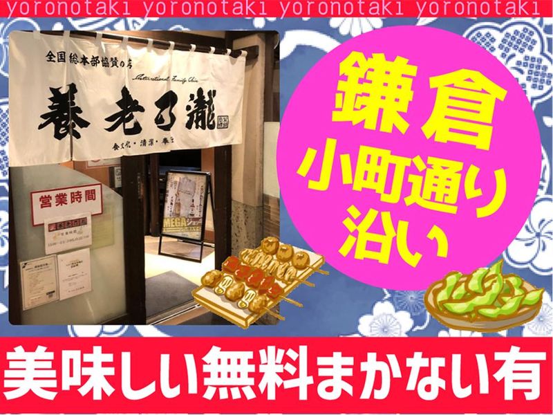 仕事内容 / 小町通りにある 常連の方に人気の居酒屋さん✨ \ まずは盛付けや簡単な調理からスタート! 慣れてきたら色々な料理を覚えて いきましょう! 洗い物は食洗器があるので簡単ですよ。 ⭐貴重な話が聞けるかも♪  ̄ ̄V ̄ ̄ ̄ ̄ ̄ ̄ ̄ ̄ ̄ ̄ 鎌倉小町通り沿いにある 居酒屋「養老乃瀧」。 地元鎌倉の常連さんとの会話も 楽しいお店です。 普段聞けない業界の話など 社会勉強になる事も たくさんあるので就活に向けた 経験にもなりますよ。 ⭐嬉しい無料まかないあり  ̄ ̄V ̄ ̄ ̄ ̄ ̄ ̄ ̄ ̄ ̄ ̄ お店のメニューから 好きなもの選んで食べれますよ♪ 絶品焼きそばや麻婆豆腐、 牛丼などイロイロな料理があります⭐ 美味しいまかないを楽しみながら 働けますよ☆彡