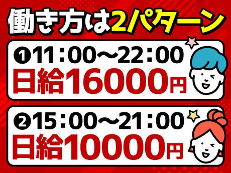 勤務時間 実働時間:10時間/日 平均勤務日数:1ヶ月あたり1日 ☆4月4日(土曜日)だけの募集です☆ ■勤務時間(選べる2パターン) (1) 11:00~22:00(休憩1h) └日給16,000円 (2) 15:00~21:00(休憩なし/実働6h) └日給10,000円 ★副業・かけもち・Wワーク・扶養内も可能!