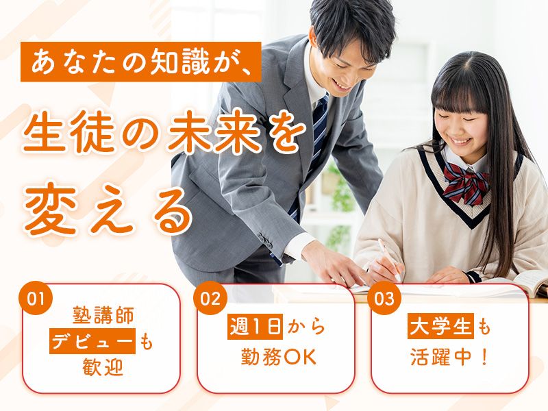 仕事内容 >>塾講師デビューの方もぜひ!! >>POINT ✔指導科目や学年選択OK ✔時給1950円~/半年ごとに昇給チャンス ✔週1日・1コマ90分からOK ✔駅チカで通いやすい ✔ネイル・ピアスOK/副業・Wワーク可 ✔ 完全未経験大学生も活躍中! >>業務内容 小学生から大学受験の生徒を対象に 個別の学習指導をお任せします。 授業準備や残業はありません。 >>指導教科 国語・数学・英語がメイン ⇒1教科だけもOK! 理科・社会も教えられる方は尚歓迎! >>未経験でも安心の研修あり ・実務前研修 ・初期研修 ・定期的な研修