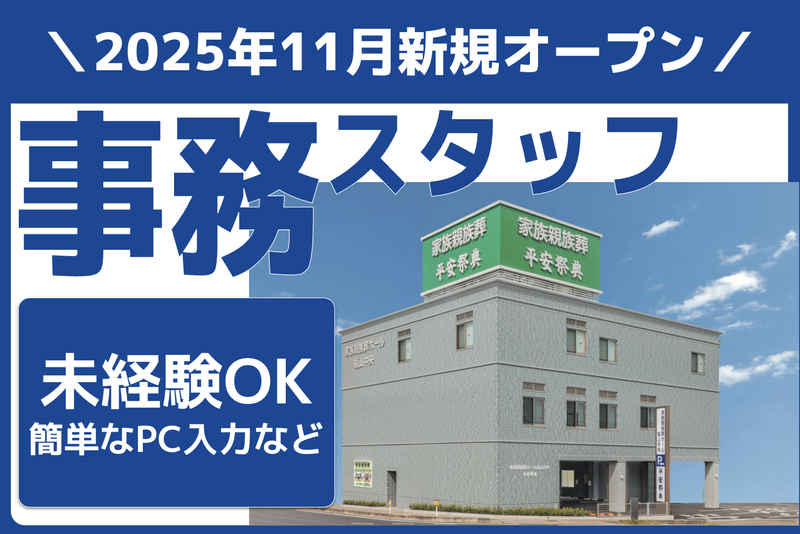 仕事内容 葬儀会館の事務所内で、 一般事務作業をお任せします。 決まったフォーマットに入力するPC作業が メインなので、PC入力ができればOKです。 また弊社ユウベルグループ互助会会員様からの、 お問い合わせ電話対応や来客対応もお願いします。 【1日の仕事の流れ】 09:00 始業、メール確認、各種対応 電話対応、各種手配、PC入力作業など 12:00 休憩 (1時間) 13:00 接客や入力作業、会館内での式準備お手伝いなど(16:00まで) 17:00 終業