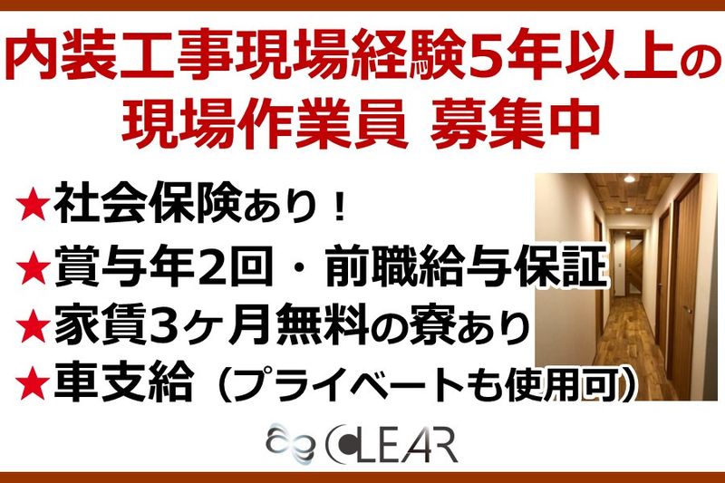 【応募資格】 自動車AT普通免許 内装工事経験者 【最終学歴】 学歴不問 【メリット】 #交通費支給 #住宅手当あり #社会保険完備 #髪型・髪色自由 #学歴不問 #寮・社宅あり #ひげOK #制服貸与 #昇給あり #賞与あり