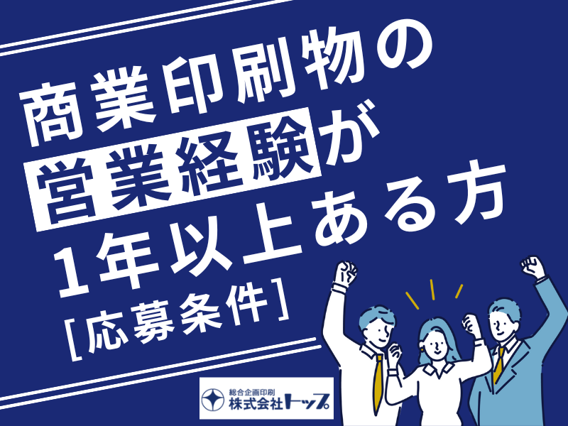 仕事内容 「印刷営業として次のステージへ進みたい」 その想いを叶える環境があります。 既存顧客中心の営業体制と高い設備力がある からこそ、個人の根性論ではなく、提案の質 そのものが成果と評価につながります。 経験を活かしながら、提案の幅や 引き出しを着実に増やしていけます。 今の経験を土台に提案力や営業の引き出しを もう一段広げられる時間と環境があります。 今の延長線では終わらせず 次のキャリアを走らせたい方にこそ、 選んでほしい職場です。 ━━━━━━━━━━━━━━━━━━━ 【仕事内容】 あなたにお願いしたいのは、官公庁や 広告代理店への提案型法人営業。 「新聞折込チラシ」や「広報誌」といった 商業印刷物の提案を行います。 ◆既存顧客(官公庁・代理店)への ルート営業 ◆打ち合わせ (サイズ・数量・納期・用紙など) ◆見積作成~受注、納品までの進行管理 ◆官公庁の入札案件対応 ◆新規クライアント開拓 (飛び込みなし/リストベース) ★担当は5〜6社を中心に最大15〜20社 ★営業エリアは23区内 ★飛び込みや遠方出張はありません ━━━━━━━━━━━━━━━━━━━ 【トップで働く魅力】 ✅ 設備投資の力で成果が出やすい ┗高性能輪転機6台を揃え、 最短12時間で納品可能。 スピード・価格・品質で 他社を圧倒する提案ができます。 ✅ プロ同士のやりとりで営業しやすい ┗取引先は広告代理店や官公庁。 印刷を理解している相手だから、 会話は専門的かつ建設的。 「無理難題のクレームに疲れる」 そんなストレスは少なめです。 ✅ 紙の未来に挑戦できる ┗媒体の見直しが進む中でも、 チラシや広報誌は“なくならない仕事”。 「形に残るもの」を扱う誇りがあります。 ━━━━━━━━━━━━━━━━━━━ 【求める人材】 変化の激しい時代の中でも、 株式会社トップは半世紀以上にわたり、 堅実に成長を続けてきた総合印刷会社です。 お客様の声に耳を傾け、 時代の流れを先読みしながら、 最適な提案を積み重ねてきました。 私たちが求めるのは、 そんな「変化を前向きに楽しめる人」。 安定した環境の中でも、新しい挑戦を恐れず お客様や仲間との 信頼を築ける方を歓迎します。 印刷という仕事は、これからも “人と人をつなぐ”役割を担い続けます。 紙の価値を守りながら、 デジタルの力も取り入れて進化を続ける。 その一員として、 ともに未来を描いていきましょう! 問い合わせ先 ▶ 054-349-1100(本社) ━━━━━━━━━━━━━━━━━━━