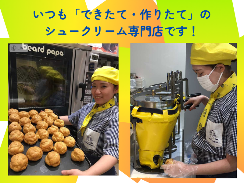仕事内容 《甘い香りに包まれてお仕事はじめてみませんか?》 《シュークリーム専門店 ビアードパパ スタッフ募集!》 ✅週2日~・1日4時間~OK! ✅未経験OK!バイトデビューも大歓迎 ✅嬉しい♪土日祝は時給UP ✅扶養内勤務OK ✅高校生もOK ✅車・バイク・自転車通勤OK ୨୧ー୨୧ 【仕事内容】 シュークリームの製造と販売 〇お店で手作りしているシュークリームの生地の焼き方などを、先輩がイチから丁寧にお教えします 。 〇その他付随する業務もあり 〇焼きたてのお菓子の香りいっぱいの中で、幸せな気持ちで働けますよ☆ ୨୧ー୨୧ \\アピールポイント// ⭐甘いもの好きに最高の職場  ̄ ̄ ̄ ̄ ̄ ̄ ̄ ̄ ̄ ̄ ̄ ̄ ̄ 新作商品の試食チャンスあり♪美味しいシュークリームが食べられます。 ⭐製造と販売の両方を経験できる  ̄ ̄ ̄ ̄ ̄ ̄ ̄ ̄ ̄ ̄ ̄ ̄ ̄ ̄ ̄ ずっとレジ打ち…などの販売だけでなく、手作りのシュークリーム製造も学べます♪ ⭐シフト融通バツグン  ̄ ̄ ̄ ̄ ̄ ̄ ̄ ̄ ̄ ̄ ̄ 1日4時間~、週2日~OK! 時間、曜日など、ライフスタイルに合わせて相談できます。
