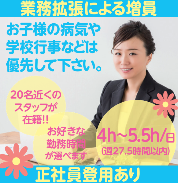 仕事内容 ⭐こんな方にピッタリ!⭐ ・家庭やプライベートと両立したい方 ・未経験から事務職にチャレンジしたい方 ・子育て世代やブランクのある方も大歓迎! ⭐働きやすさのポイント⭐ ✅勤務時間は9:00〜17:30の間で1日4〜5.5時間! 扶養内勤務もOK。 ご家庭やご自身の予定に合わせて柔軟に働けます。 ✅急なお休みにも対応! お子さまの体調不良や学校行事など、急な予定変更もお気軽にご相談ください。 ✅未経験からスタートOK! まずは簡単な業務からお任せ。 丁寧なサポート体制があるので、安心してスタートできます。 ✅幅広い年代が活躍中! 20〜50代のスタッフが在籍。 子育て中の方や子育て経験者も多く、困ったときはお互いにサポートし合える温かい職場です。 ✅コツコツ&モクモク作業が中心 一つ一つの仕事に集中できる環境です。 静かで落ち着いた雰囲気の中、マイペースに働けます。 ✅勤務開始時期応相談! 夏休み明けや、在職中の方、転職はもう少し先に考えている方など 勤務スタート日も相談可能ですので、 お気軽にお申し付けください。 ⭐お任せするお仕事⭐ ・紙書類のスキャン保存 ・Excelでの資料作成やデータ入力 ・会計ソフト・給与ソフトへの入力 など ・事務作業が中心なので、PCの基本操作ができればOKです! ⭐職場環境⭐ 休憩中はスタッフ同士で気軽におしゃべりしたり、情報交換したりと、アットホームな雰囲気。 シフトやお休みの相談もしやすく、子育てや家庭の事情にも理解のある職場です。 ⭐税理士法人 畠経営グループについて⭐ 創業50周年を迎えた、地域密着型の会計事務所です。 税務監査や経営コンサルティング、業種特化コンサルティングなど幅広いサービスを展開し、地元企業様から厚い信頼をいただいています。 グループ7社のネットワークと70名のスタッフで、お客様の経営を全力サポートしています。 - 創業=昭和49年、従業員数=70名、平均年齢39.5歳