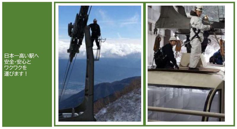 仕事内容 ━━━━━━━━━━━━━━━━━━━ 未経験から 安全のエキスパートへ ━━━━━━━━━━━━━━━━━━━ ✅日本でも珍しい索道技術の仕事 ✅装備や工具の使い方はイチから学べる ✅山岳特有の気候や地理にも精通できる =================== ━━━━━━━━━━━━━━━━━━━ ■■■ 仕事内容はこちら ■■■ ━━━━━━━━━━━━━━━━━━━ 山岳リゾートでは欠かせないロープウエイ 安全に利用頂くための技術職募集です! ロープウエイ特化型の日常メンテナンス、 補修・鉄塔などの整備も実施します。 *ー⭐ここがレアポイント⭐ー* また技術面だけではなく、運転業務や 乗降時の補助業務なども行えるので、 利用者の笑顔にも直接触れる機会あり! \まさにロープウエイに特化した専門職/ ━━━━━━━━━━━━━━━━━━━ 具体的には… ●山岳ロープウェイのメンテナンス業務 ・点検整備作業(搬器、モーター等) ・給油作業(索条、ベアリング等) ・鉄塔作業(部品交換、点検等) ●ロープウェイの駅務 ・ロープウェイの車掌、運行案内 ・乗客係(改札、安全管理など) ※業務内容は時期にもよりますが、 約50%ずつ行っていきます。 現在、技術スタッフが4名在籍しています。 基本2人体制での作業です。 ━━━━━━━━━━━━━━━━━━━ ■■■ 入社後は ■■■ ━━━━━━━━━━━━━━━━━━━ 先輩社員と一緒にロープウェイや鉄塔の メンテナンス作業のアシスタント。 駅務にも入りながら、エキスパートとして 技術や経験を積み重ねます。 ロープウェイの構造やヒヤリ・ハット、 フルハーネス講習等、安全に関わる研修は しっかりとフォローいたします。 ━━━━━━━━━━━━━━━━━━━ ■■■ キャリアアップの道 ■■■ ━━━━━━━━━━━━━━━━━━━ 技術職として腕を磨いていく中で、 協力会社との連携も不可欠です。 索道関連会社と定期的なミーティングを 重ね、知識と人脈を広げていきます。 ゆくゆくは施設の管理者、責任者として ステップアップすることも可能です。