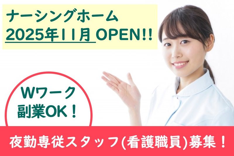 【アピールポイント】 2025年11月OPEN! ナーシングホームの夜勤専従スタッフ(看護職員)募集! ●週1回からOK! ●Wワーク・副業OK! ●勤務日数はご相談ください! ●介護施設未経験OK! ●ブランクある方OK! ●研修制度やフォロー体制充実!