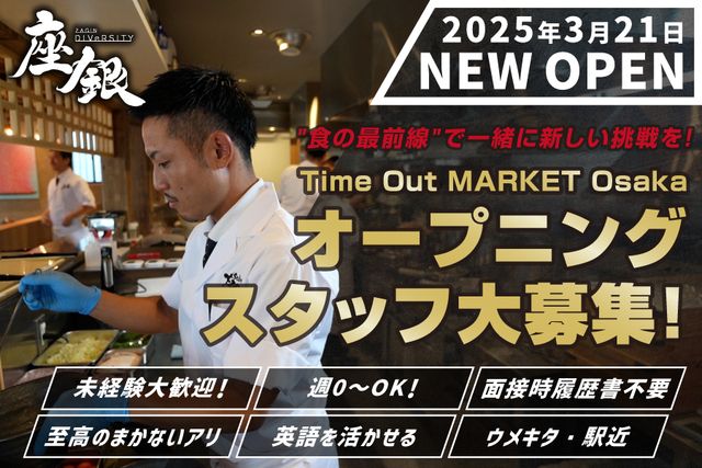 仕事内容 梅北(ウメキタ)に3月21日に新店舗がオープン! 座銀DIVERSITY(ダイバーシティ)★ オープニングスタッフ大募集!採用人数20名以上★ 時給1200円〜スタートです! 海外からのお客様とのやり取りや メディアへの露出など普段経験できない体験が ここではできます! ========☆ <仕事内容> ■商品の提供 ■ラーメンの簡単な盛り付け ※バッシング、皿洗い、テーブル清掃に関しては フードコートスタッフがすべて行って下さいます。 簡単なことからお任せ◎ 少しずつできることを増やしていきましょう! 簡単なことからお任せ◎ 少しずつできることを増やしていきましょう! 【アピールポイント】 アジア初進出となるタイムアウトマーケット大阪は、 オフィス、ホテル、商業施設、都市公園、住宅などが一体となった 大阪駅前の貨物ヤード跡地の大規模複合開発の「うめきたプロジェクト」の「うめきた2期地区開発プロジェクト」の商業エリアに出店します。 タイムアウトマーケット大阪では、関西のトップクラスのシェフやレストランの料理をはじめ、受賞歴のあるミクストロジストのカクテルや大阪の新進気鋭のアーティストが生み出すカルチャーやエンターテイメントを楽しむことができます。約3,000?のスペースに厳選された15のレストランに加え、2つのバーが軒を並べます。 (フードコードスタイルになります) その中に、銀の葡萄から、座銀DIVERSITYとして出店します。 2025年は大阪・関西万博が開催され、世界中から何百万人もの人々が訪れる、大阪にとって歴史的で記念すべき年となります。 少しでも大阪の盛り上がりに貢献できるように進めていきましょう! <面接時履歴書不要!> 〈面接時は私服でOK〉 ■シフトの柔軟性◎  ̄ ̄ ̄ ̄ ̄ ̄ ̄ ̄ ̄ 「ランチタイムだけ…」 「週5でがっつり…」 「テスト期間は週0!」 など、シフトの融通はかなり利くので 気軽にご相談ください! ■おいしい!まかないあり◎  ̄ ̄ ̄ ̄ ̄ ̄ ̄ 並んでしか食べれない! 絶品まかないを お腹いっぱい食べられますよ♪ 【休日・休暇】 ▼1日3h〜OK ▼Wワークやかけもち・副業OK ▼扶養内勤務OK ▼土日祝のみ・平日のみOK 【待遇・福利厚生】 ▼昇給あり ▼交通費全額支給 ▼まかないあり ▼おしゃれな制服貸与 ▼社員登用制度有 ▼履歴書不要 ▼店舗内禁煙