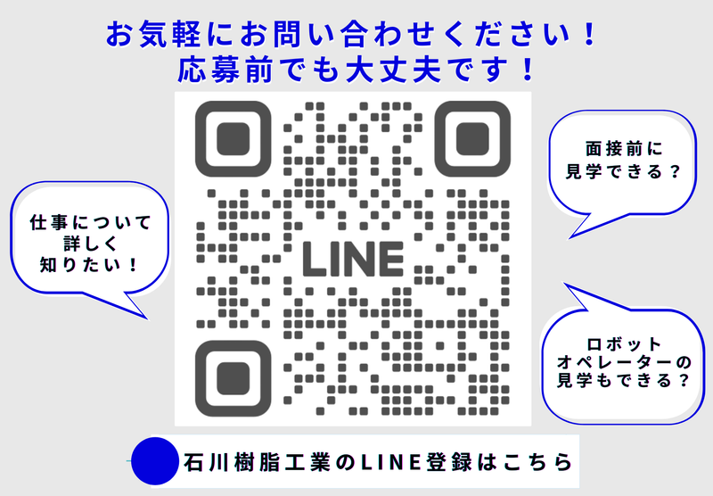 仕事内容 20代男性、30代男性の入社決定! 「これからの時代に通用するスキルを身につけたい」 そんなあなたにぴったりの “ロボットを操る最先端モノづくり” のお仕事です。 ◆ポイントを3分で読めるように、簡単に紹介します! ====================== \このお仕事のおすすめポイント/ ✅未経験から挑戦OK!基礎研修+現場研修で“ロボット操作”をゼロから学べる ✅しっかり稼げる!実質月給28.6万円+賞与年2回 ✅20代・30代活躍中!風通しのよいフレンドリーな現場 ✅将来はリーダーやプログラミング担当へキャリアアップ可能 ✅社食300円、制服貸与、資格取得支援あり ✅髪型・髪色・ひげ自由!自分らしいスタイルで働ける ◎この求人は40歳未満の方向けです◎ ====================== <募集背景> 私たち石川樹脂工業が作る樹脂製食器「ARAS」は、実は食器ジャンルでインスタフォロワー数日本一! 売上好調につき、生産ラインの拡大に向けて、一緒に働く仲間を増員募集します。 まずは“職場見学”からでも大歓迎! LINEからもお気軽にご連絡ください♪ https://lin.ee/GAi5seH (QRコード画像からも登録できます) ──────────────────── ▶仕事内容 ──────────────────── “1000回落としても割れないうつわ” ARAS製品をつくる 製造ロボットオペレーターとして、 樹脂成型機・産業用ロボットの操作をお任せします。 【入社後すぐ(安心スタート!)】 ・製品の目視検査、箱詰めなどの成形ライン作業 ・ニッパーでのカット、バリ取りなどの仕上げ作業 ・原料(25kg袋入)の補充 【慣れてきたら(スキルアップ!)】 ・フォークリフトやクレーン資格を活かした金型交換 ・産業用ロボットのティーチング(動きのプログラム) ・成形条件の調整による製品品質の最適化 ★スタッフのほとんどが未経験スタート! 研修やサポート体制が整っているので安心です◎ ──────────────────── ▶この仕事の推しポイント! ──────────────────── ◎ ロボット&AIを“使う側”に回れる! 数ヶ月の現場研修+「ファナック」での専門研修を経て、 1〜2年後にはロボットを自在に動かすオペレーターに成長できます。 ◎ 稼げる交替勤務! 実質月給28.6万円〜、残業代は1分単位で支給。 深夜・交替勤務手当もついて安定収入を確保できます。 ◎ キャリアアップを後押し! 資格取得支援あり。経験を積めばリーダーやプログラミング担当への道も。 ◎ 最新の環境へ進化中! 受注好調につき約1年半後に新工場を建設予定。 完成後は空調完備の快適な環境が整います。 ──────────────────── ▶正直、この仕事の大変な点は? 交替勤務制のため、最初は生活リズムの調整が必要です。 ですが、1週間ごとのシフト切り替えなので予定は立てやすく、 「平日昼にゆっくり過ごせる」 「病院や役所に行きやすい」など、 意外と好評です◎ また、深夜手当(基本給の25%)・交替手当(1.5万円)がつくので、 収入面では大きなメリットがあります! ──────────────────── ──────────────────── ▶当社のことが気になった方へ ──────────────────── ➽ 石川樹脂工業ってどんな会社? 創業70年以上の歴史を持ち、石川県加賀市で、樹脂製品生産の先駆けとして成長してきたものづくり企業です。 自社ブランド「ARAS」は、“デザイン×機能性”を両立した新しい食器ブランドとして注目され、売上はこの3年で約10倍に急拡大。 全体売上も現在の22億円規模から、2030年には100億円を目指す成長戦略を進めています。 ✅ 公式サイトでARASの製品や会社のことをもっと知る ▶ARAS 公式Instagram https://www.instagram.com/aras.japan/ ▶ブランドサイト https://ishikawajyushi.net/aras/ ▶企業HP https://ishikawajyushi.net/ ▶採用サイト https://www.ishikawajyushi-recruit.com/ ~~~~~~~~~~~~~~~ 最後に… 「ちょっと面白そう」「まずは話だけ聞いてみたい」 そんな気持ちの方もぜひお気軽にご応募くださいね♪ ~~~~~~~~~~~~~~~