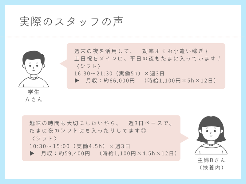 時給1,100円~1,200円 給与詳細 基本給:時給 1100円 〜 1200円 【給与例】 給与例 働き方に合わせて、これくらい稼げます! ■夕方から働くフリーター・主婦(夫)さん  ̄ ̄ ̄ ̄ ̄ ̄ ̄ ̄ ̄ ̄ ̄ ̄ ̄ ̄ ̄ ̄ ̄ ̄ ̄ ̄ 「昼間は自分の時間。 夕方からサクッと勤務!」 〈シフト〉 17:00〜21:30(実働4.5h)×週4日 ▶ 月収:約79,200円 (時給1,100円×4.5h×16日) ■土日祝メインで働く学生・Wワークさん  ̄ ̄ ̄ ̄ ̄ ̄ ̄ ̄ ̄ ̄ ̄ ̄ ̄ ̄ ̄ ̄ ̄ ̄ ̄ 「週末の夜を活用して、 効率よくお小遣い稼ぎ!」 〈シフト〉 16:30〜21:30(実働5h)×週2日 ▶ 月収:約44,000円 (時給1,100円×5h×8日) ★美味しい「まかない」があるので 食費も浮きます♪