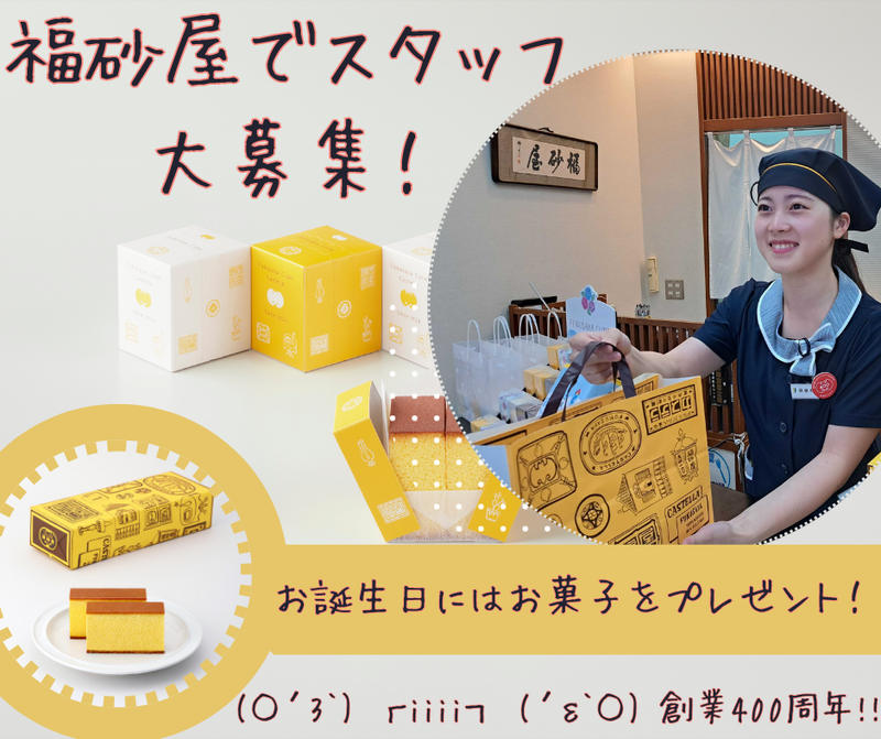 仕事内容 ✨⭐2026年1月28日OPEN⭐✨ ――――――――――――――― 新店舗のオープンにあたり、 オープニングスタッフを募集します! ⭐週3日~OK!平日・土日のみOK ⭐9:00~18:00/12:30~21:30 ⭐早番・遅番の勤務が可能な方、大歓迎 ⭐販売・接客経験者歓迎✨ ⭐カステラがお得に買える社割あり ⭐半年に1度、評価に応じた昇給制度あり (○´3`)‗┌iiii┐‗(´ε`○) \創業400周年を迎えました/ ――――――――――――――― 寛永元年(1624年)創業 カステラの老舗企業『福砂屋』。 今回は『ラゾーナ川崎』に 新規オープンする店舗で 一緒に働く販売スタッフを大募集! / なんと!? お誕生日には お菓子をプレゼント♪ \ 【具体的には】 ✅レジ ✅接客 ✅お歳暮などの配送対応 ✅商品の補充 =作業は簡単でシンプル= 商品補充は、段ボールを持って バックヤードと店舗を 往復していただきます。 重たいので気を付けて運んでくださいね◎ 「カステラが好きな方」 「人と話すのが好きな方」 そんな方にピッタリです♪ ■………………………………………□ 接客・販売の経験者大歓迎! □………………………………………■ □■『福砂屋』について■□ 熟練の職人技で作り上げた ふっくらしっとり感のあるカステラは、 お土産の定番として多くのお客様から ご好評をいただいています。 包みが小箱になっており 食べきりサイズのフクサキューブは、 見た目も可愛く人気の商品です♪ 創業から400年以上、 長く愛され続ける『福砂屋』の カステラ作りを是非一緒に支えてください✨