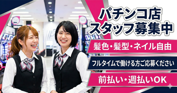 PR・職場情報 【 オシャレも収入も、どっちも欲張る! 】 *・。・*・。・*・。・*・。・* 髪色・ネイル・ピアス自由 「自分らしさ」全開で働けます♪ *・。・*・。・*・。・*・。・* 「推し活資金を貯めたい」「美容代に回したい」 ◎そんな理由で応募される方も多数です◎ 【 当求人のここがPoint! 】 ◎ 重い玉運びは一切なし! ⇒力に自信が無くても大丈夫♪ ◎ 未経験でも最初から高時給スタート! ⇒研修中も給与カットなしで稼げます ◎ 日払い・前払い制度あり ⇒「今月ピンチ!」の強い味方です! ◎ シフト相談も柔軟に対応 ⇒平日のみ・週末のみ…ワガママOK! ━━━━━━━━━━━━━━━━━ フリーターさん 多数活躍中 ━━━━━━━━━━━━━━━━━ ☆ 週5でガッツリ稼ぎたい派も、 プライベート優先派もご応募下さい ☆ 夢を追うあなたも全力で応援中! 声優・モデル・バンドなど 夢と両立している仲間が多数活躍しています ━━━━━━━━━━━━━━━━━