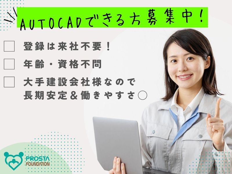 求めている人材 ◆応募スキル *Auto-CADの基本操作可能な方 *Office操作の出来る方 (Excel:四則演算レベル/Word:上書きレベル ) ◆活かせる経験 *Auto-CADの基本操作 *ブランクOK *英語力不要 \経験が少なくてもお気軽にエントリーください!/ - ◆派遣先の情報 *派遣先 大手建設会社*長期大型工事のため長く働きたい方は必見 *業種 建設業 *配属先について - 空調完備、ロッカー貸与、男女トイレ別 - 男女比:男性90% - 期間:【急募】即日~長期 ※まずは2カ月からの契約となります。 - 仕事NO:PSTA-900T-CD