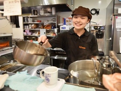 仕事内容 ◆◆ホール・キッチンスタッフ募集◆◆ \接客も調理も丁寧にお教えします/ お席のご案内&オーダー取り、 配膳、レジ、調理、ドリンク作りなど♪ サンドイッチなどの軽食作りや 季節限定のスイーツ作りも楽しめますよ! 「飲食店は初めて…」 「接客したことない」 という方も、コメダ珈琲店では たくさん働いています。 1人1人のペースに合わせて お仕事を覚えていただける環境なので 安心してスタートしていただけます! \★メリット盛りだくさん!★/ ◎土日祝に働くと時給100円UP ◎GW・お盆・正月シーズンは時給150円UP ◎週2日~&短時間もフルもOK! ◎コーヒーや軽食・デザートの社割あり ◎アルバイト・パートからの正社員登用実績あり ◆◆焦らずじっくり♪のびのびと働けます!◆◆ 少しずつ慣れていただけるように 丁寧な研修制度をご用意しています。 *⌒*⌒*⌒*⌒**⌒*⌒*⌒*⌒* ★まずは動画を視聴します♪ …………………………………… 接客方法やレジの使い方などを 1分ほどの短い動画にまとめています。 話を聞くだけより、お仕事の流れが グッとわかりやすくなります。 *⌒*⌒*⌒*⌒**⌒*⌒*⌒*⌒* ★次は、食器の片付けから。 …………………………………… お料理を運ぶのはまだ先です♪ コメダ珈琲店では有田焼の食器を 使っているのでトレーにのせてみて、 持ち方や重さを学んだり、キッチン内で カトラリーの整理をお願いします。 *⌒*⌒*⌒*⌒**⌒*⌒*⌒*⌒* ★慣れてきたら、おひとり様から担当! …………………………………… 大人数のお客様をいきなり担当すると 緊張したり、焦ったりしてしまうので まずは1人で来店されたお客様を 丁寧に対応してみましょう。 一連の流れがスムーズにできるようになってから 実際に料理の提供にチャレンジしていただきます。