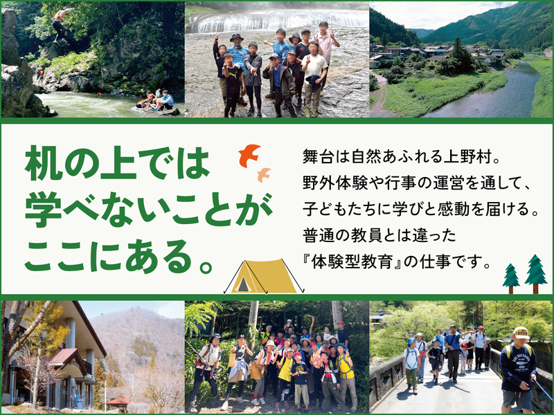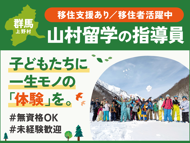 仕事内容 上野村の大自然の中で、 子ども達と一緒に成長しませんか? *・・*・・*・・*・・*・・*・・*・・*・・* ・子ども達の成長を近くでサポート! ・上野村から生活面のサポートあり! ・村営住宅完備で安心して暮らせる! ・村内では月500円でネット使い放題! 【 かじかの里学園とは・・・ 】 山村留学として上野村の豊かな 大自然の中で子ども達に人としての 本来の暮らしを体験させ、 集団生活で人との繋がりや思いやり、 自立心を育むことができます。 私たちは、日々の学園生活を 通して子ども達が本来持っている 力を伸ばせる環境を提供しています。 <仕事内容> ・学園の指導員として、 下記の業務をお任せします! 【 学園生指導/サポート 】 ==================== *学園イベントの企画、運営 (登山、サイクリング、川遊び、モノ作り) *生活支援 (相談対応、マナー指導など) ※業務での役割分担あり 【 学園の運営 】 ==================== *広報活動 (HP・SNS更新、月間通信作成、求人活動など) *食事関連業務 (調理、献立作成、食材の発注、在庫管理など) *事務作業 (データ入力・管理、写真撮影・記録など) *衛生管理 (掃除、感染症対策、傷病対応など) *安全管理(避難訓練、フロー整備など) *保険関係業務 (手続き、医療備品の補充など) *農作業(畑の管理など) *施設管理 (外観整備、修繕作業、廃棄物処理など) *車両管理(メンテナンス、車検対応など) *経理管理(銀行対応、振込作業など) *勤怠管理 *学園生募集 *対外折衝 (学校・教育委員会・役場・他団体など) *保護者対応 ==================== 【移住&入社したスタッフの声】 以前お世話になった方から 「100年先の日本だと惚れ込んでいる」と 紹介されたのが上野村でした。 その中で「子どもたちのことを考え行動する」 ことが仕事に直結する、山村留学施設の 仕事が魅力的に見えたので、思い切って 上野村へ移住を決意! 「かじかの里学園」は子どもたちが親元を 離れて1年間の里山生活を体験する場所。 ここで子どもたちと一緒に野菜を作ったり、 炊事をしたり、星を眺めたり…。 様々な自然体験を経て、子どもたちの 確かな成長に日々幸せを感じています。 ご近所さんも一緒に子供を見守ってくれる 安心感があり、感性を育てる豊かな 自然環境もたくさん。 古き良き日本の暮らしが現存する上野村は 子育てに最高の場所だと思います! ==================== <群馬県・上野村への移住を応援!> 上野村は移住支援が整っており、 人口の20%は移住者が住む村。 I・Uターン者は年々増加傾向にあります。 「村営住宅の貸付」や「子育て支援」 「生活補給金」などの移住支援もあり、 山ぐらしや地域おこしなどに 興味がある方にはピッタリです。 ==================== 【 かじかの里学園HP 】 https://kajikanosato.jp/ 【 かじかの里学園Instagram 】 https://www.instagram.com/kajikanosato.uenomura/?locale=ja_JP 【 かじかの里学園YouTube 】 https://www.youtube.com/@kajikanosatogakuen_official 【 上野村の移住支援など 】 http://www.uenomura.jp/admin/migration/ui/ (上野村ホームページ)