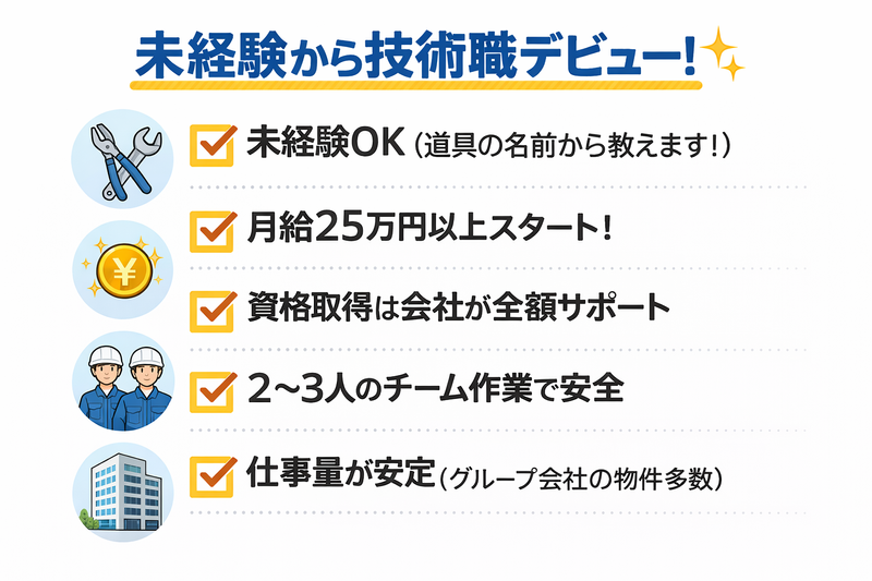 仕事内容 《未経験OK!上田市内の賃貸住宅での点検・軽作業スタッフ》 この仕事は営業じゃありません。 訪問先はすべて管理会社から依頼が入った物件だけ。 飛び込み・売り込み・契約・ノルマは一切ありません。 《この仕事のポイント!》 ◎ 未経験OK(工具の名前から教えます) ◎ 上田市内のみ・移動ラク♪ ◎ チーム作業で一人現場なし ◎ 生活インフラだから仕事量が安定 ◎ 資格取得は会社がサポート 《仕事内容》 上田市内の賃貸アパート・マンションを巡回し、 設備の点検と簡単な修理を行います。 【具体的な業務内容】 ・ガスコンロ/給湯器の動作チェック ・エアコンの清掃・点検 ・トイレや水栓の軽い修理 ・退去時の立ち合い(業者手配あり) *現場は上田市内のみ *1日数件をチームで対応 *重たい工事・深夜作業なし 《未経験でも“できる理由”》 今働いている人の多くが 元・飲食、販売、工場、配送などの未経験者。 入社後は ・工具の名前 ・部品の扱い方 ・点検の手順 を先輩が横について1つずつ教えます。 いきなり一人で現場に出ることはありません! 《こんな方にピッタリ》 ・ノルマに追われる仕事が嫌 ・体を動かす仕事がしたい ・手に職をつけたい ・上田市で安定して働きたい ・人と話すのが苦手じゃない 《安定して働ける理由》 ガス・エアコン・水回りは 人が住む限り必ず必要な仕事。 だから景気に左右されにくく、 上田市で長く働ける 生活インフラの仕事です。