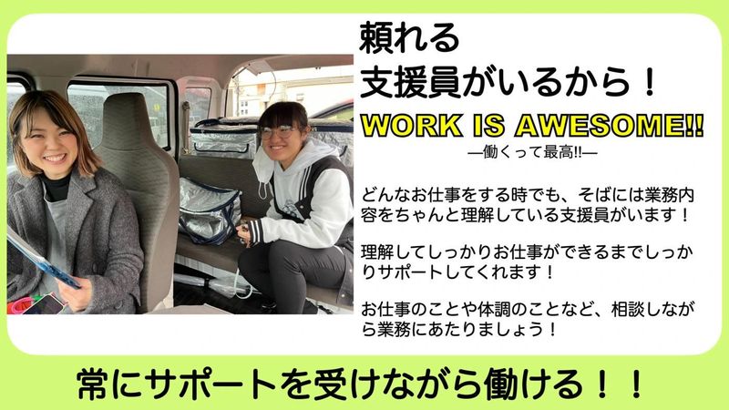 職場環境 看護師による毎日の問診など医療連携も万全。 元利用者さんの女性支援員が同じ目線で寄り添います。 作業当日は事務所に集合し、仲間と現場へ向かうので一人になる不安もありません。 特性を尊重し、チームで支え合いながら自分らしく働ける環境です。