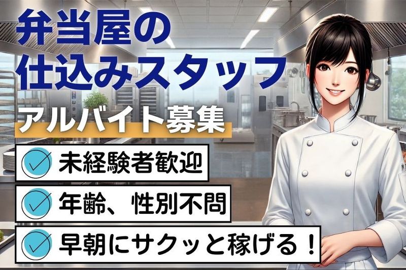 【仕事内容】 弊社は大手デパートにて、全国でも人気なお弁当を販売している会社です。 ECサイトでも積極的に販売しており、この度セントラルキッチンにて弁当調理に伴う仕込みスタッフを募集しております。 ✨接客は一切なし! 接客が苦手な人でも自分のペースで取り組み、黙々と作業していただけます。 また、自分がつくったお弁当が大手デパートで販売されるので達成感も味わえます! 早朝時間を効率よく利用したい方にピッタリの職場です。 【業務内容】 お弁当の調理、盛り付け、仕込み等をお願いします。 <具体的な業務内容> ・おかずの詰め作業 ・調理補助 ・洗い場 など ================== ✅初心者でも安心、始めやすい仕事です ================== 特別なスキルや経験が不要で、料理好きな方にぴったりな環境です。 また、決められた時間内で働けるので生活リズムも合わせやすいですよ。 ===================== ✅料理スキルが身につき、成長を実感できます ===================== 仕込み業務を通して、食材の扱い方や盛り付けなど、家庭でもできる技術を自然と習得できます。 【求人ID-JUN】