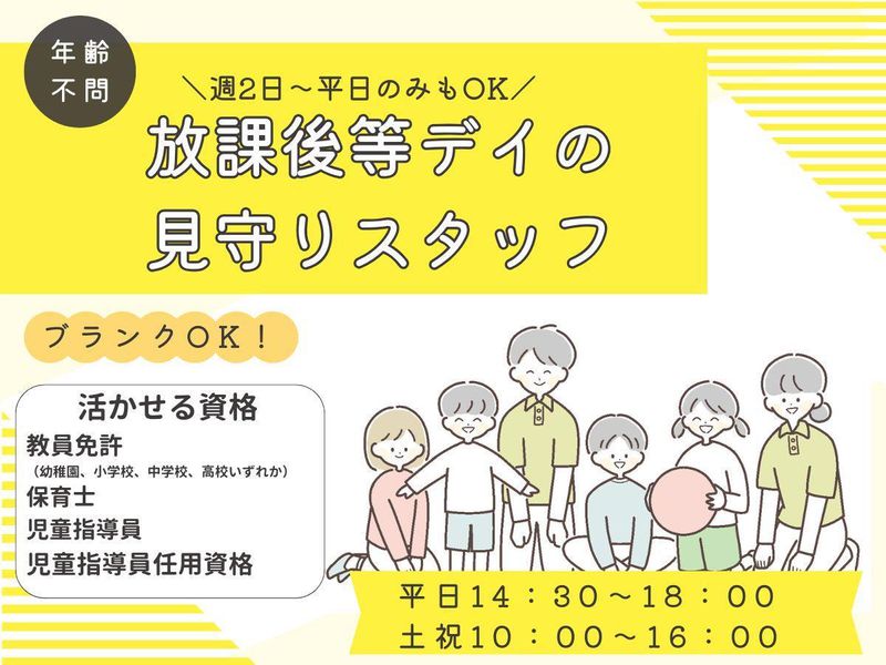 仕事内容 / お子様たちの成長を サポートするお仕事です! \ 放課後等デイ未経験でも 安心のサポート体制あり☆ 経験がなくてもしっかり教えますので、 安心してご応募ください。 ✨二郎駅、田尾寺駅、道場南口駅から通勤しているスタッフが多くいます。 【お仕事内容】 ・主にお子様の送り迎えや見守りをお任せします。 ・すぐに慣れる簡単な業務ですので、特別なスキルは不要! ・シフトは柔軟に対応可能で、ご都合に合わせて働けます! ・ブランクがあっても大丈夫。あなたのペースで始められます。 【具体的な業務内容】 ――――――――――――――― ・活動サポート 子どもたちが遊んだり、学んだりするのを見守りながらサポートします。 お子様たちの笑顔がやりがいに繋がります! ・学習・宿題サポート 一人ひとりに寄り添って学習をサポートし、 「できた!」の瞬間を一緒に喜びます。 ・遊び・活動の実施 創作活動や外遊び、音楽の時間など、 子どもたちと一緒に楽しみながら進めます。 ・個別支援 発達を促す活動や生活スキル向上の支援を行います。 【職場環境】 ――――――――――――――― ・当事業所は子どもたち一人ひとりに向き合える優しい環境で、育休明けやブランクがある方も大歓迎! ・資格を活かしたい、職場復帰したい方にもピッタリの職場です。 【資格を活かせます!】 ――――――――――――――― ブランクがあっても大歓迎! ・幼稚園、小学校、中学校、高校いずれかの教員免許 ・保育士 ・児童指導員・児童指導員任用資格 上記をお持ちの方の採用です! ※無資格の方はご相談ください。