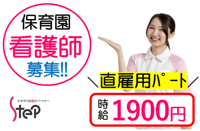 ◆月収29万円以上も叶います◆ 夜勤なし♪ 嬉しい高時給! 土日祝休み☆ 株式会社ステップグランドスタッフ 平日のみ勤務の正看護師 . ■案件NO,15351■お電話で案件番号をお伝えください! *:;;;:*:;;;:**:;;;:*:;;;:**:;;;:*:;;;:* 保育園の正看護師の 職業紹介求人案件です♪ *:;;;:*:;;;:**:;;;:*:;;;:**:;;;:*:;;;:* \働きやすさ☆/ ◆直雇用パート ◆残業ほぼなし ◆土日祝休み ◆17時迄勤務 ◆夜勤なし かわいい子どもたちに囲まれて 夜勤のないお仕事がしたい 看護師さんにオススメ☆ 子育てや家庭と両立したい方や パートで働きたい方に◎ ____________ 今回の派遣先は、当社と長く お付き合いのある園さんです☆ 園長先生をはじめ、先生方の 人柄もよく、すぐに輪の中に 溶け込める雰囲気です(^^) ____________ ▼こんな園さんです ・定員140名の認可保育園 ・0~5歳児が通います ・開園時間は7:30~19:00 20代、30代、40代を中心に 幅広い年齢層の方が活躍中! ____________ \ステップのここが嬉しい/ 園への見学時も同行します☆ 働く上で園へ伝えておきたいこと、 時間の相談などなど ご自身では伝えにくいことも コーディネーターが伝えますので 見学時も安心です♪ 事前に園の雰囲気を知ってから 入職に繋げることができるのも 嬉しいポイント! 1人で悩まなくても大丈夫! 保育士としての経験がある コーディネーターが あなたのお仕事開始まで 精一杯サポートします! ・・・・・・・・・・・・・・ \希望登録/も受付中! 希望の条件で働けるチャンス☆ 通勤時間や、勤務時間、勤務曜日など ご希望をお聞かせいただいた上で あなたにぴったりの園さんを ご提案させていただきます♪ .