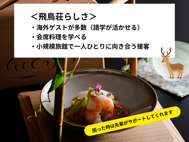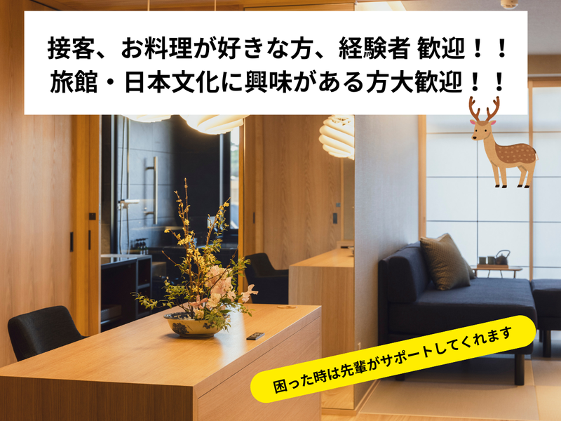 求めている人材 このポジションは、物おじせずに人との対話を楽しめる方で、かつ人の気持ちを察することに長けた方に向いたお仕事です。 旅館の仕事は常にチームワークですので、常に仲間と協力しながらミッションを成し遂げることが好きな方にも向いています。 <未経験の方、歓迎> 旅館・ホテルなどでの勤務経験やアルバイト経験がなくても大丈夫です。 また先輩スタッフのサポートによっても、お客様への接客方法や、おもてなしの心を学ぶことが出来ます。 <具体例> ■飲食店やアパレルなどの接客業での経験を活かしたい方 ■旅館・ホテルでの就業経験をお持ちの方 ■4時間ほどのパートタイムで働きたい方 ■子育てなどでフルタイムは難しいがパートで働きたい方 ■「人を好きな人」「人を笑わせることが出来る人」「人のために何かをするのが好きな人」 ■ホテル・旅館での就業経験はないが、おもてなし業には興味がある方 ■外国語のスキルを活かしたい方(日常会話程度で充分です) ■日本料理や器をはじめ日本の文化に興味をお持ちの方 性別の条件と理由:女性限定(ポジティブアクション)