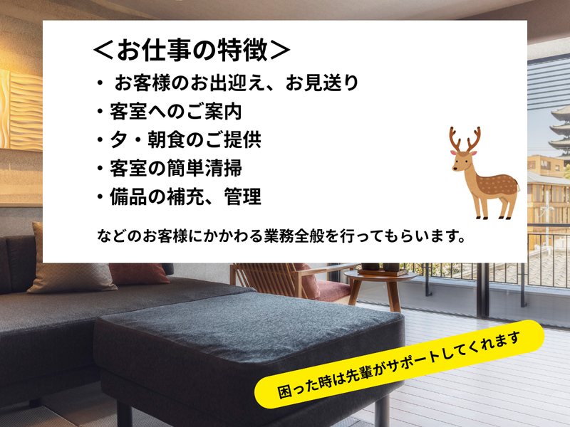 仕事内容 ■具体的な業務 ・お客様のお出迎え、お見送り ・客室へのご案内 ・朝・夕食のご提供 ・客室の簡単清掃 ・備品の補充 などのお客様にかかわる業務全般を行ってもらいます。