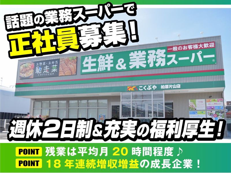 仕事内容 業務スーパーでの販売スタッフを募集します。 <ここが魅力!> ★18年連続増収増益の成長企業! ★週休2日で土日休みも可能! ★残業も月20時間程度! ★未経験歓迎!採用は人柄重視! ★車通勤可能! 仕事場までマイカーで通勤で楽々! ★将来的には店舗運営や本社勤務 などキャリアプランは豊富! <具体的には> ◇接客・販売・レジ ◇品出し・陳列 ◇特設コーナーの企画・商品配置 ◇在庫管理、商品発注 ◇店内のPOP作成など <ある1日の流れ> ◇08:00 出勤して商品を陳列 ◇09:00 開店後、レジ打ちや商品補充など ◇12:00 お昼休憩 ランチもゆっくり食べられます ◇13:00 在庫を確認し、 少なくなっている商品があれば発注 その後、接客・レジ打ちに ◇18:00 終業→退社 <未経験歓迎!> 未経験の方には、まず「簡単なこと」 「できること」からお任せしていきます。 店舗として新人さんの受け入れも多く、 ていねいに育成を行っていますので、 ご安心ください。 少しずつ仕事を覚えながら 着実に成長していける環境です。 <スタッフの声> 短期・単発の仕事が多く、安定した収入で働きたいと考えていました。 早朝・深夜・夜勤と働く時間もバラバラな上に 中高年といわれる世代の主婦には厳しい環境でした。 そんな時にこくぶやに出会い、 経験・学歴は関係なく、人柄で採用いただけました。 新店オープンなどもあり、まだまだポストはたくさん。 コツコツと真面目に働いていれば評価してくれる会社です。 皆さんともお会いできるのを楽しみにしております。 <こんな経験を活かせます> ◇食品スーパー、ドラッグストア、 コンビニなどでの勤務経験 ◇アパレル店、カフェなどでの勤務経験 ◇ファミレス・小売店などでの レジや品出し、販売業務の経験 ◇お弁当屋・惣菜店などでの 調理経験・接客経験 ◇オープニング、店舗立ち上げの経験 ◇バイトリーダーや店長などの マネジメント経験 【下記エリアから通うスタッフ活躍中】 富田林市、河内長野市、羽曳野市、大阪狭山市、河南町、太子町、堺市美原区、藤井寺市、 堺市南区、橋本市、松原市、堺市東区、千早赤坂村、和泉市、堺市中区、八尾市 <各駅からもアクセス◎> 喜志駅、富田林駅、富田林西口駅、 滝谷駅、川西駅、滝谷不動駅 <株式会社こくぶや> 創業50年!ここ18年は連続で業績UP中! 大阪・奈良を中心に 「業務スーパー」9店を展開しています。 会社の成長に伴い、 さらに今後の事業拡大を見据えて、 いま社員を増員募集中です。 一般社員から店長へ、 店長から地域統括マネージャーへ! さらに将来は店舗運営、店舗開発、 本社勤務といった道もあり! 豊富なキャリアプランがありますので、 様々な将来を描いていただけます。