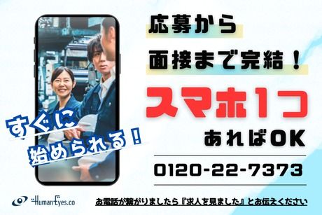 選考プロセス リモート面接(約30分) 遠慮なく何でもお話ください ↓ 工場見学(約1時間) 実際に働いて頂く職場を自分の目で確認! ※工場最寄り駅から送迎、もしくは現地集合 ↓ 入社手続き(約1時間) 書類記入や入社前教育を行います ↓ 入社 最短で1~1.5週間で入社が可能です 入社日の調整も可能!面接時にご相談ください 【問合せ先について】 問合せ先:0120-227-373 【お電話での応募はこちら】 0120-22-7373 応募受付センター (受付時間:平日9時~18時) 求人番号:ri-11871115 応募方法 応募するボタンをクリック ↓ 3営業日以内に弊社からメッセージまたは電話にて ご連絡をさせて頂きます。 メッセージのチェックをお忘れなく! ※応募多数の場合は書類選考の可能性あり