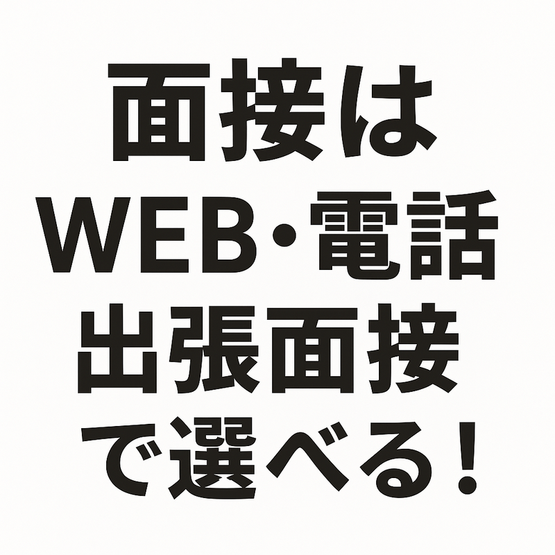 選考プロセス 【応募後の流れ】 応募いただいた後はこちらからご連絡いたします。 電話に出ていただけると嬉しいです★ 面接はWEB or 電話 or 出張面接を実施! ★希望の面接方法を教えてください! ★WEB・電話面接は来社不要で楽ちん♪ ★対面の面接当日は普段着でお越しくださいね♪ ★すぐ働き出したい方、必見◎選考結果はスグにお伝えします! ―――――――――――――――――――――― *お電話でのお問い合わせも大歓迎! *お仕事内容・職場の雰囲気・働き方等、ご質問等お気軽にお問い合わせください。