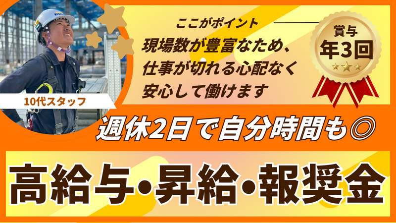 仕事内容 西山建設です! 数ある求人の中からご覧いただき ありがとうございます! 当社はさいたま市に本社を置き創業から50年以上、 大手ゼネコンの一次請けとして、大型プロジェクトや 有名な建築物の現場を数多く手がけています。 「今の環境よりもっと稼ぎたい」 「技術を磨いて上を目指したい」 そんな想いを持つ経験者の方を、 私たちは全力で歓迎します。 【仕事内容】 主に新築物件の建設現場にて、 とび工事全般をお任せします。 具体的には ・足場の組立て/解体 ・仮設設備の設置 ・現場の安全設備設置など 現場では、10代・20代の若手から ベテランまで幅広い世代が活躍中! スタッフの平均年齢は39歳で活気ある職場です。 チームで協力して作業を進めるため コミュニケーションを大切に安全第一で 業務に取り組んでいます。 【ここがポイント!】 ◎高水準の給与と年3回の賞与! 日給1万6000円〜2万3000円。 あなたの積み上げてきた技術や経験は正当に評価します。 年3回の賞与で、頑張りもしっかり還元します! ◎プライベートも大切にできます! 週休2日&残業はほとんどありません。 「自分や家族との時間を増やしたい」 という方も、 メリハリをつけて働ける環境です。 ◎遠方の方も安心の「寮完備」! 「新しい土地で挑戦したい」 という方をサポートできるよう、 社員寮をご用意しています。