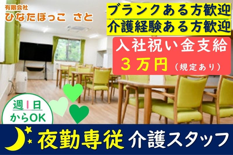 【アピールポイント】 「夜勤」新規スタッフ募集! ◎入社祝い金3万円支給(規定あり) ●介護施設経験のある方歓迎! ●ブランクある方歓迎! ●週1日からOK!(希望日数ご相談ください)