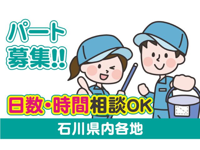 仕事内容 石川県内各地の現場で 清掃のお仕事をお願いします。 ◎年齢不問、未経験の方も大歓迎! ◎勤務日数・時間相談OK ◎WワークもOK!ライフスタイルに合わせた 働き方をご相談ください 【お仕事内容】 小松営業所(小松市城南町88番2)に 出社後、県内各地の作業場所へ移動し、 床ワックスやガラス清掃など 施設内の定期清掃を行っていただきます。 難しい作業はありませんので 未経験の方も安心してご応募ください。 作業手順等は、イチから丁寧に教えます! 分からないことや質問など 気軽に声をかけてくださいね! しっかりフォローいたします。 \WワークOK/働き方イロイロ/ 勤務日数や時間はご相談に応じます。 WワークもOK! 家事や育児と両立しながら働きたい、 しっかりフルタイムで働きたい、など ご希望の働き方をご相談ください。 【男女・年齢不問】 年齢・性別は問わず活躍しています。 子育てが落ち着いた方、 「運動不足を解消したい」 「お小遣い稼ぎをしたい」 「定年後の働き口として」 そんな方も多数活躍中です。 経験のある方も、ない方も 是非、ご応募をお待ちしております。 まずはお気軽にお問い合わせください。