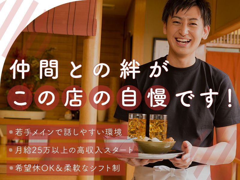仕事内容 +:-:+:-:+:+:-:+:-:+:+:-:+:-:+:+:-:+ 頑張りが評価される環境で 仲間たちと活躍したい! +:-:+:-:+:+:-:+:-:+:+:-:+:-:+:+:-:+ ↓↓求人のPOINTを要チェック↓↓ ✅10〜20代の若手スタッフ活躍中! ✅随時昇給!お金にもこだわれる ✅希望休OK&シフトは柔軟に対応 ✅スキルアップできるOJT制度あり ✅面接1回のスピード採用! …まだまだ魅力は尽きません! ↓↓ 気になる方はこの先をCHECK ↓↓ 仕事内容はコチラ ┈┈┈┈┈┈┈┈《01》 居酒屋における ホール・キッチン業務をおまかせ! まずはホールで雰囲気に慣れながら キッチンも担当していきましょう! ゼロから成長できる ┈┈┈┈┈┈┈┈《02》 教育体制が充実しているため、 初めての方も安心して働けます。 わからないことはなんでも相談OK!