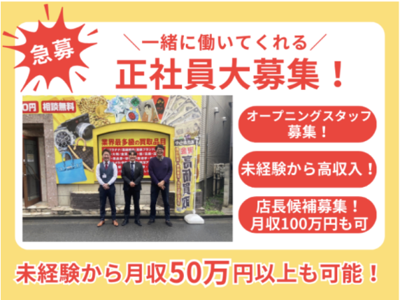 仕事内容 *Fluency in Japanese (native level) in both speaking and writing skills are required* ✨王子駅に2026年6月新店舗オープン✨ \オープニングスタッフ大募集!/ 【未経験入社9割】。 そのうち【80%が初年度年収600万円以上】を実現しています。 採用強化に伴い、 今だけ!入社祝い金50万円プレゼント! 先着3名の早い者勝ち✨ ※詳細は、面接時にご案内いたします。 「結婚を機に、将来を真剣に考え始めた」 「子供が生まれるから、もっと稼ぎたい」 「でも、今の仕事は残業ばかりで先が見えない…」 そんなライフスタイルの変化をキッカケに転職し、 「家族との時間」と「家族を養う収入」の両方を手に入れた先輩(パパ・プレパパ世代)が、 当社では多数活躍しています✨ ・――・――・――・――・――・ 【家族との時間】と【家族を養う収入】。 その両方を、当社で手に入れませんか? ✅19時退社&残業月10h以下 家族との夕食や子供とのお風呂も「当たり前」に。 ✅月給26万円を「保証」 未経験でも、家族を支えるベース収入をしっかり確保。 ✅頑張りは「青天井」のインセンティブで還元 成約率75%!頑張りが収入に直結します(平均月収40万円) ・――・――・――・――・――・ 【仕事内容】 ⒈ 集客・マーケティング活動 (例:店頭でのご案内、チラシのポスティング戦略など) ※成果を出すための「工夫」が評価されます! ※じっと待つだけではなく、自分から動くことが高収入のコツです✨ ⒉ お客様対応(接客) ご来店されたお客様をお迎えし、お品物をお預かりします。 ⒊ 査定(本部へ依頼) 商品を撮影し、本部へデータ送信。 ⒋ 買取成立 本部から届いた査定額をお客様にご提示し、買取成立です。