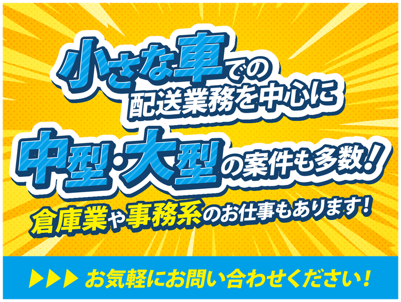 仕事内容 普通免許でOK! 1BOXサイズのナビ付AT小型の 平ボディトラック(1t・1.5t)で 新品の乗用車タイヤをカー用品店等へ配達するお仕事! 固定ルート配送です◎ 一部倉庫内での作業があります。(商品の整理整頓など) タイヤの運搬には台車を 利用することも出来るのでラクラク! ・長期歓迎! ・増員募集! ・AT限定可! ・固定ルート配送 ・週休2日 ・残業すくなめの日勤 ・女性も活躍中 長期のお仕事です! 誰にでもできる簡単な業務になります。 配達先はカー用品店、ディーラー、 ガソリンスタンド、自動車修理工場などです。 ※普通免許(AT限定)で始められる高時給のお仕事 ※運転好きにオススメです。 ※年齢に不安がある方もお気軽にお問い合わせください! 一人立ちできるまで、しっかり同乗期間を設けます。 時間をかけてゆっくり覚えて頂けますので 未経験の方やブランクが心配な方もご安心ください♪ 簡単ではありますが、 お電話やメールでも 詳細をお伝えできますので 気になることがあれば、遠慮なく 何でもお気軽にお問い合わせ下さい!
